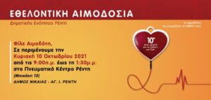 Εθελοντική αιμοδοσία διοργανώνει ο Δήμος Νίκαιας-Αγ.Ι. Ρέντη την Κυριακή, 10 Οκτωβρίου από τις 9 το πρωί έως τη 1:30 μετά το μεσημέρι στο Πνευματικό Κέντρο Αγ.Ι. Ρέντη (Μπιχάκη 15) με την υποστήριξη του Κέντρου Αιμοδοσίας του Περιφερειακού Γενικού Νοσοκομείου Νίκαιας “ο Άγιος Παντελεήμων”. Ο Δήμος Νίκαιας – Αγ. Ι. Ρέντη, ενισχύει ακόμα περισσότερο τις δράσεις αλληλεγγύης και κοινωνικής προσφοράς με τη διοργάνωση εθελοντικής αιμοδοσίας, προκειμένου να αντιμετωπιστεί η μείωση των αποθεμάτων αίματος στην χώρα.