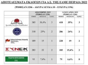 Ξανά 1η δύναμη η ΑΓΩΝΙΣΤΙΚΗ ΣΥΣΠΕΙΡΩΣΗ ΕΚΠΑΙΔΕΥΤΙΚΩΝ (ΑΣΕ), με πολύ μεγάλη διαφορά και νέα αύξηση σε ψήφους και ποσοστά, στις εκλογές της ΕΛΜΕ Πειραιά.Η ενίσχυση της ΑΣΕ κ η ανάδειξή της σε 1η δύναμη για πάνω από μια δεκαετία, αποτελεί εφόδιο για να δυναμώσει ο αγώνας ενάντια στην αντιεκπαιδευτική πολιτική, για την αγωνιστική πορεία της ΕΛΜΕ μας.