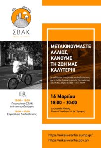 Η 2η εκδήλωση ενημέρωσης και διαβούλευσης για το Σχέδιο Βιώσιμης Αστικής Κινητικότητας (ΣΒΑΚ) θα πραγματοποιηθεί την Τετάρτη 16 Μαρτίου στις 6 τo απόγευμα στο Δημαρχείο Νίκαιας (Π. Τσαλδάρη 10, αίθουσα εκδηλώσεων).