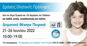 Ο Δήμος Πειραιά και «Το Χαμόγελο του Παιδιού», αναγνωρίζοντας τον καθοριστικό ρόλο της πρόληψης σε κρίσιμους τομείς που αφορούν στη ζωή και τα δικαιώματα των παιδιών, συνδιοργανώνουν και υλοποιούν δωρεάν Δράσεις Ολιστικής Πρόληψης, 21 έως 26 Ιουνίου 2022 και ώρες 10:00 έως 19:00, στον Προαύλιο χώρο του Δημοτικού Θεάτρου Πειραιά.