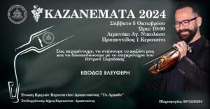 Ο Πρόεδρος και τα μέλη του Δ.Σ. της Ένωσης Κρητών Κερατσινίου – Δραπετσώνας “Το Αρκάδι” και ο Δήμος Κερατσινίου – Δραπετσώνας, σας προσκαλούν το Σάββατο 5 Οκτωβρίου 2024 και ώρα 19:00 στο Λιμανάκι Αγίου Νικολάου, να στήσουμε το ρακοκάζανό μας, να δείξουμε τον τρόπο παραγωγής της ρακής και να διασκεδάσουμε με το συγκρότημα του Πέτρου Σαριδάκη και τα χορευτικά τμήματα της Ένωσης.