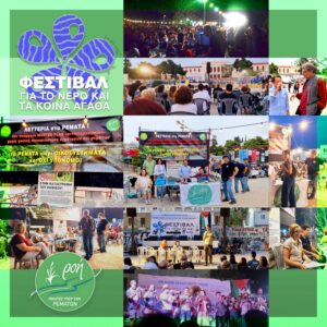 Συμμετείχαμε στο Φεστιβάλ «Για το Νερό και τα Κοινά Αγαθά» με «σημείο» ενημέρωσης γύρω από τον Σύλλογο, συναντήσαμε παλιούς συνοδοιπόρους στο πεδίο του αγώνα για την προστασία των Κοινών Αγαθών, ανταλλάξαμε απόψεις γύρω από την σημασία της προστασίας των ρεμάτων, τοποθετηθήκαμε μέσω εκπροσώπου μας σχετικά με τους σκοπούς της «Ροής» και τις πολυετείς δράσεις της και πραγματοποιήσαμε εγγραφές νέων μελών.