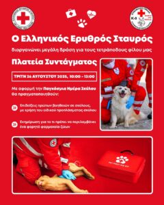 Ο Ελληνικός Ερυθρός Σταυρός (Ε.Ε.Σ), με αφορμή την Παγκόσμια Ημέρα σκύλου(26/8), διοργανώνει μεγάλη δράση την Τρίτη (26/8) και ώρες 10:00 – 13:00, στην Πλατεία Συντάγματος (πλησίον σταθμού Μετρό), με στόχο την εξοικείωση του κοινού με τις Πρώτες Βοήθειες για σκύλους. Το πρωτοποριακό, καινοτόμο πρόγραμμα εκπαίδευσης Πρώτων Βοηθειών για σκύλους που υλοποιεί ο Ε.Ε.Σ. σε όλη την Ελλάδα.