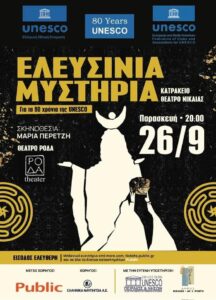 Κεντρικό γεγονός της βραδιάς αποτελεί η θεατρική παράσταση “ΕΛΕΥΣΙΝΙΑ ΜΥΣΤΗΡΙΑ”, από τη βραβευμένη Θεατρική Ομάδα ΡΟΔΑ, σε σκηνοθεσία Μαρίας Περετζή.