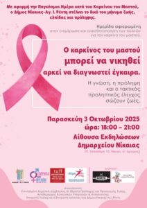 Με αφορμή την Παγκόσμια Ημέρα κατά του Καρκίνου του Μαστού, ο Δήμος μας διοργανώνει μια ξεχωριστή ημερίδα αφιερωμένη στην ενημέρωση, ευαισθητοποίηση και πρόληψη.