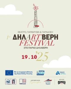 Το φεστιβάλ ΔΗΛΑRTΒΕΡΗ, μια γιορτή πολιτισμού, έρχεται για πρώτη φορά την Κυριακή 19 Οκτωβρίου 2025 στο πάρκο Δηλαβέρη (Δαβάκη Πίνδου 17) στον Πειραιά, με ελεύθερη είσοδο για μικρούς και μεγάλους, εντάσσοντας το πάρκο στον πολιτιστικό χάρτη της πόλης.