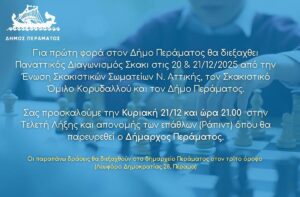 Στο Δήμο του Περάματος διεξάγεται φέτος για πρώτη φορά Παναττικός Διαγωνισμός ΣΚΑΚΙ, το Σαββατοκύριακο 20 & 21 Δεκεμβρίου 2025 που διοργανώνεται από την Ενωση Σκακιστικών Σωματείων Ν. Αττικής, τον Σκακιστικό Όμιλο Κορυδαλλού και τον Δήμο Περάματος.