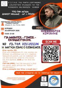 Παράλληλα, θα λάβουν μέρος γονείς και μαθητές της Γ’ Τάξης από το 1ο Γυμνάσιο Ρέντη «Αλέξανδρος Παπαδιαμάντης» και το 3ο Γυμνάσιο Ρέντη.